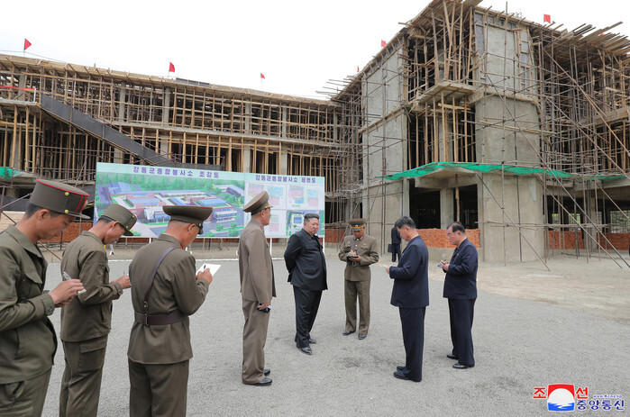 North Korean leader Kim Jong-un (5th from L) inspects the construction site for a hospital and a general service center in Kangdong County, Pyongyang, on June 2, 2025, in this photo released by the North's official Korean Central News Agency the next day. (For Use Only in the Republic of Korea. No Redistribution) (Yonhap)
