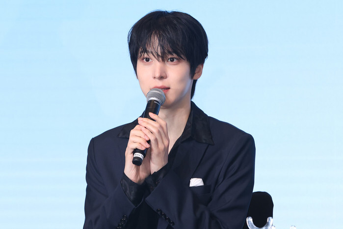 Yoonho, a member of South Korean boy group Ateez, speaks during a showcase for the group's12th mini album "Golden Hour: Part 3" in Seoul on June 12, 2025. (Yonhap)
