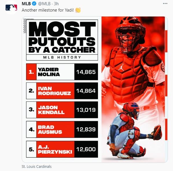 | ▲ 몰리나, 1만4천86개의 풋아웃…MLB 포수 신기록 [메이저리그 공식 트위터 캡처. 재판매 및 DB금지] |