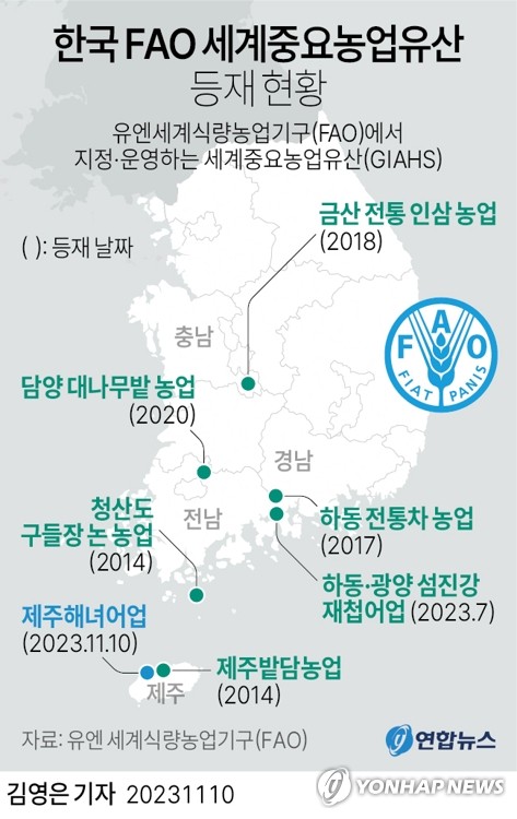 | ▲ [그래픽] 한국 FAO 세계중요농업유산 등재 현황 (서울=연합뉴스) 김영은 기자 = 0eun@yna.co.kr 트위터 @yonhap_graphics 페이스북 tuney.kr/LeYN1 |