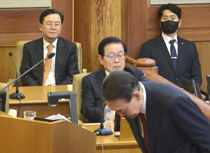 President Yoon Suk Yeol bows after delivering his final statement at the Constitutional Court in Seoul on Feb. 25, 2025, during the 11th and final hearing of his impeachment trial in connection to his short-lived imposition of martial law in December, in this photo provided by the court. (PHOTO NOT FOR SALE) (Yonhap)