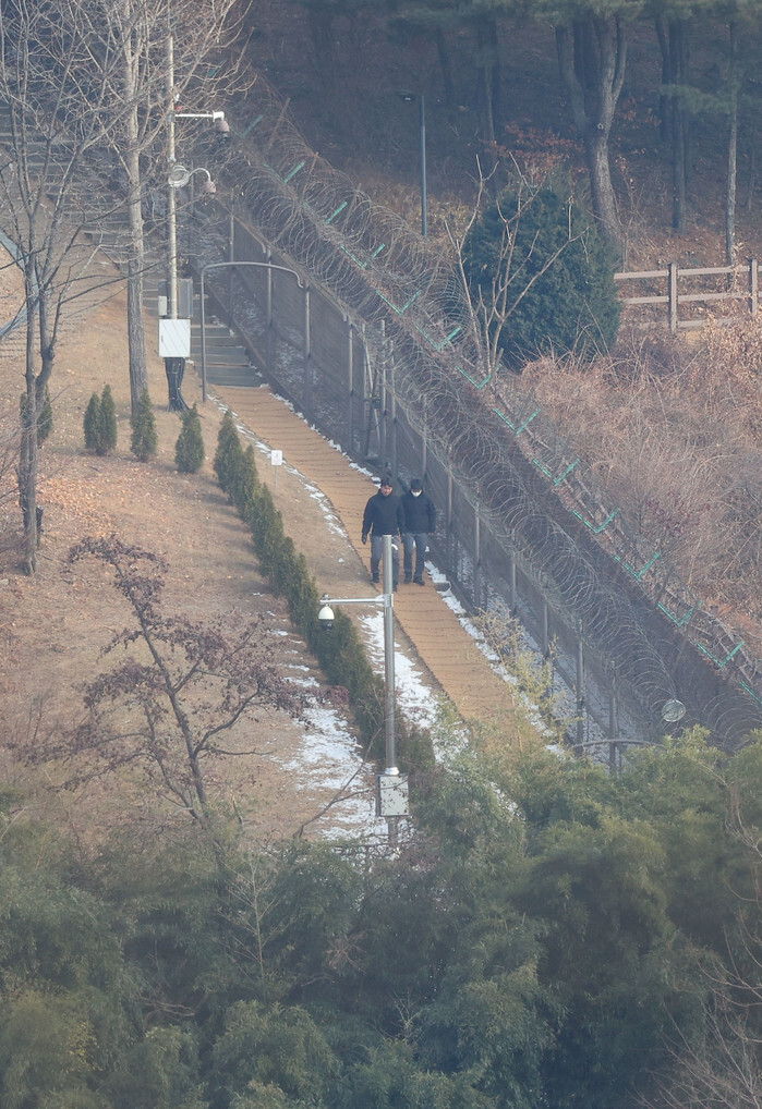 People believed to be security guards walk next to barbed-wire entanglements at impeached President Yoon Suk Yeol's official residence in Seoul on Jan. 12, 2025, as investigators led by the Corruption Investigation Office for High-ranking Officials are expected to execute a second warrant to detain Yoon in connection to his short-lived imposition of martial law. (Yonhap)