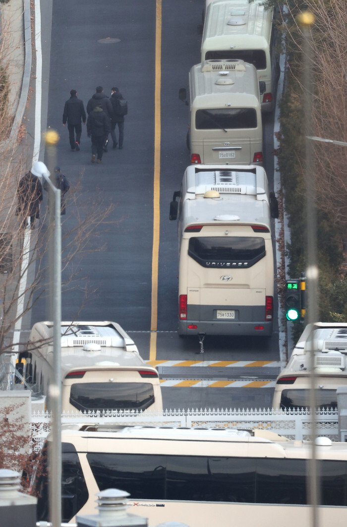 People believed to be security guards walk near the entrance of impeached President Yoon Suk Yeol's official residence in Seoul on Jan. 12, 2025, as investigators led by the Corruption Investigation Office for High-ranking Officials are expected to execute a second warrant to detain Yoon in connection to his short-lived imposition of martial law. (Yonhap)