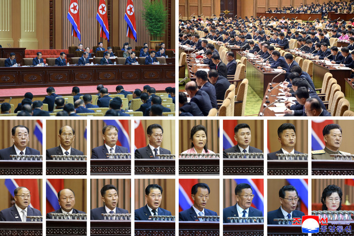 A session of the Supreme People's Assembly, the country's parliament, is under way with North Korea's leader Kim Jong-un in attendance at Mansudae Assembly Hall in Pyongyang, in this undated combined photo released by the North's official Korean Central News Agency on Sept. 22, 2025. In the session held Sept. 20-21, Kim said Pyongyang has an intent to sit down with the United States if Washington drops its "hollow" obsession with denuclearization, saying he has a good memory of U.S. President Donald Trump. (For Use Only in the Republic of Korea. No Redistribution) (Yonhap)