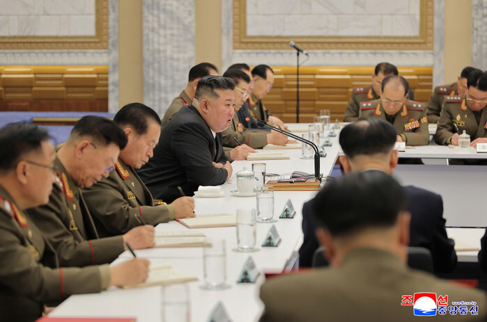 North Korean leader Kim Jong-un (4th from L) speaks during an enlarged meeting of the Central Military Commission of the Workers' Party of Korea at the headquarters of the party's Central Committee in Pyongyang on May 28, 2025, in this photo released by the North's official Korean Central News Agency on May 30. During the meeting, North Korea replaced senior military officials, including directors of the armed forces' artillery and security bureau. (For Use Only in the Republic of Korea. No Redistribution) (Yonhap)