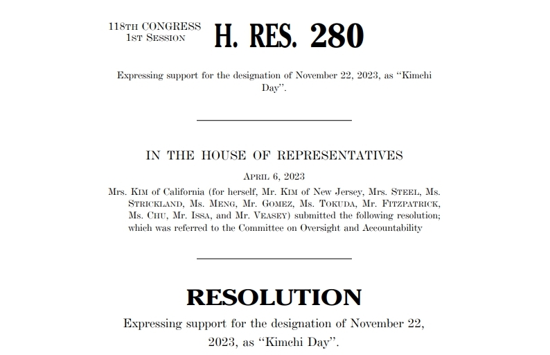 앞서 캘리포니아와 버지니아, 뉴욕 등 미국의 일부 주(州)가 김치의 날을 기념일로 선포했지만, 미국 연방 차원에서 공식 기념일로 지정하자는 의회 결의안이 상정되는 것은 이번이 처음이다.