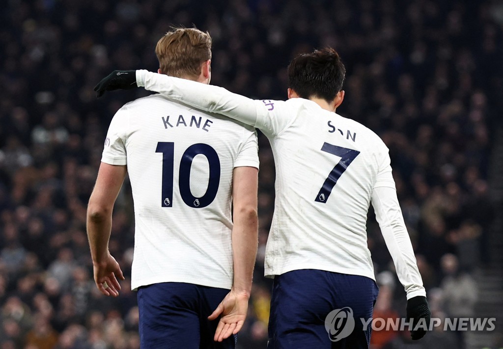 | ▲ In this Reuters photo, Son Heung-min of Tottenham Hotspur (R) congratulates teammate Harry Kane on scoring a goal against Everton during the clubs' Premier League match at Tottenham Hotspur Stadium in London on March 7, 2022. (Yonhap) |