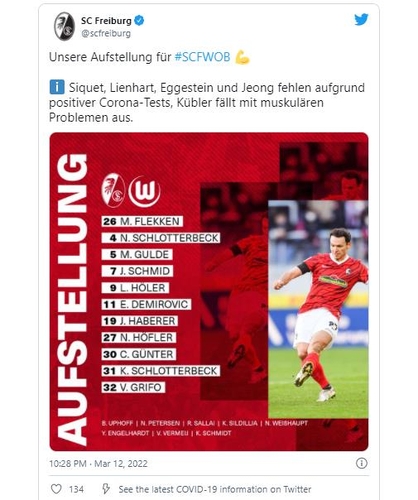 | ▲ 코로나19 양성 판정을 받은 정우영의 결장 소식을 전한 프라이부르크. [프라이부르크 구단 SNS. 재판매 및 DB 금지] |