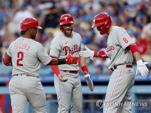 | ▲ 필라델피아 필리스의 헤안 세구라(왼쪽)와 브라이스 하퍼(가운데) [게티이미지/AFP=연합뉴스] |