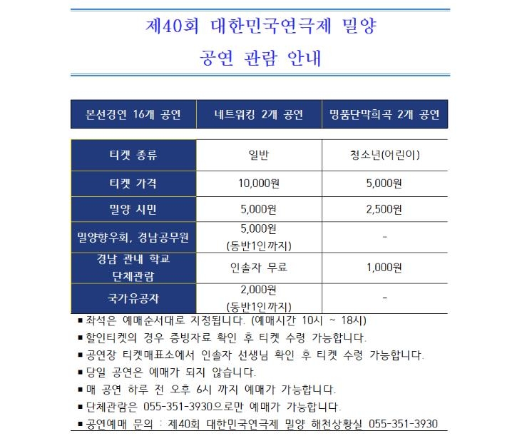 밀양시와 한국연극협회는 본선 경연, 네트워킹 페스티벌, 명품 단막 희곡전을 제외한 나머지 공연 프로그램은 무료로 진행해 공연 진입장벽을 크게 낮췄다.