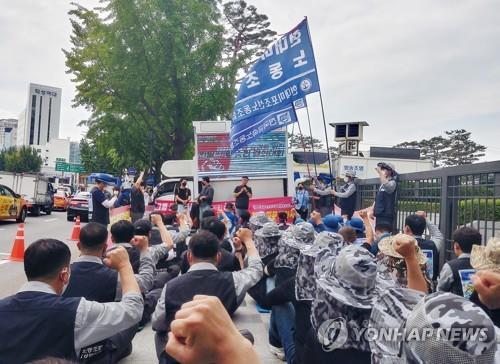 | ▲ This file photo provided by the labor union of Hyundai Heavy Industries Co. on July 18, 2022, shows unionists of HD Hyundai's three shipyard units holding a rally to demand the start of this year's wage talks in front of the group's office in Seoul. (PHOTO NOT FOR SALE) (Yonhap) |