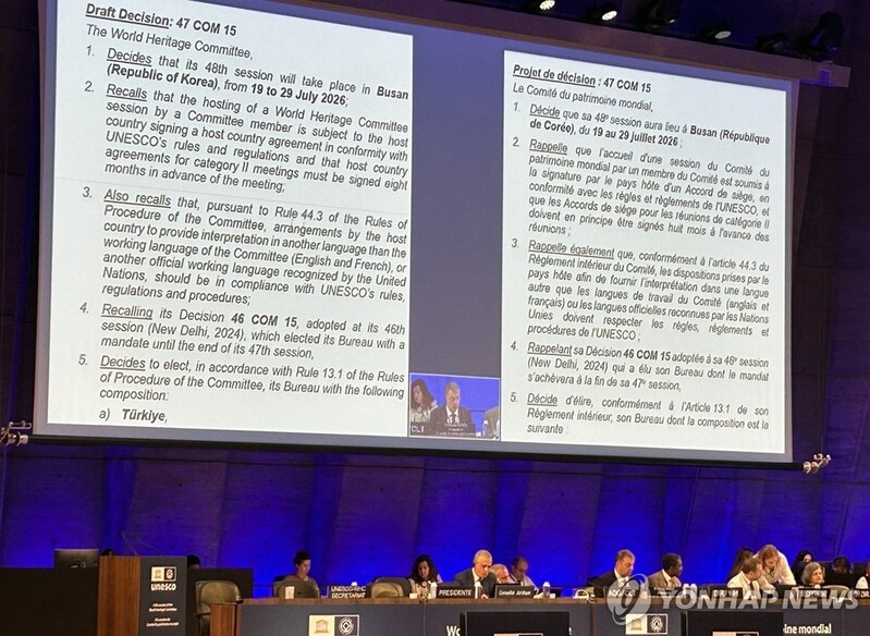 | ▲ 내년 세계유산위원회, 부산서 열린다 (파리=연합뉴스) 김예나 기자 = 15일(현지시간) 프랑스 파리 유네스코 본부에서 제47차 세계유산위원회가 열리고 있다. 이날 세계유산위는 차기 개최국으로 대한민국을 확정했다. 제48차 위원회는 내년 7월 19∼29일 부산에서 열릴 예정이다. 2025.7.16 yes@yna.co.kr |