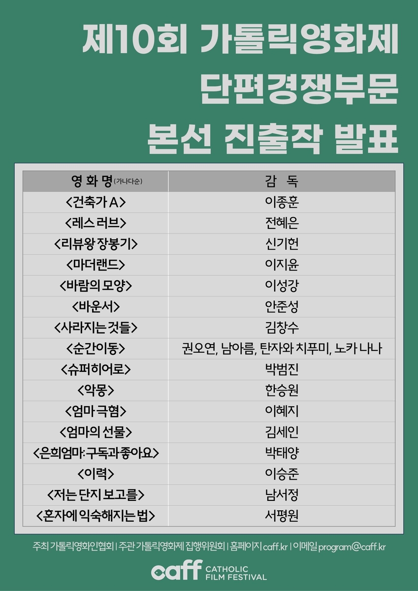 가톨릭영화인협회는 이날 단편 경쟁 부문 본선에 오른 작품들의 명단을 공개했다. '건축가 A'(이종훈 감독), '레스 러브'(전혜은), '리뷰왕 장봉기'(신기헌)를 포함한 16편이다.