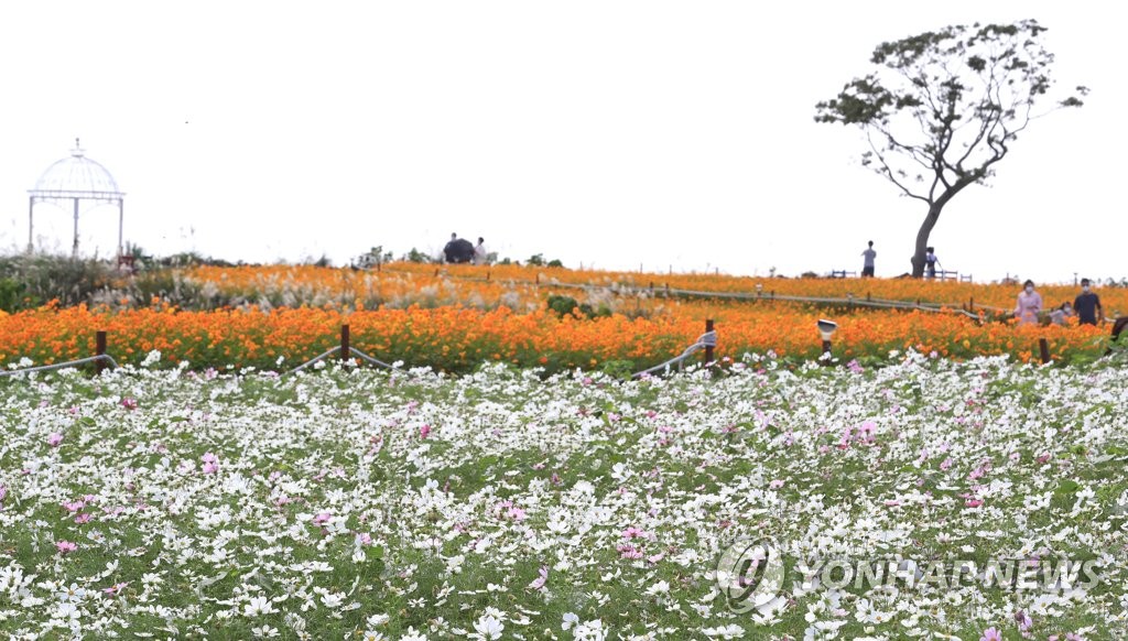 ▲ 절정으로 치닫는 제주의 가을 (서귀포=연합뉴스) 박지호 기자 = 11일 오후 제주 서귀포시 안덕면 신화월드를 찾은 관광객이 활짝 핀 코스모스 길을 걸으며 가을 정취를 만끽하고 있다. 2021.10.11 jihopark@yna.co.kr