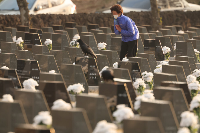 A bereaved family member visits a stone marker for her missing kin at Peace Park in the city of Jeju on South Korea's largest island of the same name on April 3, 2025, the 77th anniversary of a 1948-1954 massacre caused by an ideological rift between residents of Jeju Island and the mainland government. The April 3 incident led to the killing of tens of thousands of Jeju residents. (Yonhap)