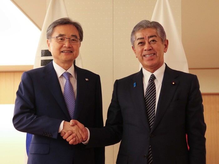 South Korean Foreign Minister Cho Hyun (L) and Japanese Foreign Minister Takeshi Iwaya pose for a photo during their meeting at the foreign ministry in Tokyo on July 29, 2025. (Yonhap)