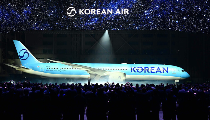 A Boeing 787-10 aircraft of Korean Air Co., South Korea's flagship air carrier, bears the airline's new aircraft livery, or the exterior insignia for planes, during a publicity event at its hangar in Seoul on March 11, 2025. The new design prominently displays "KOREAN" in large lettering on the aircraft's forward fuselage but without "AIR" from the company's full name. (Pool photo) (Yonhap)