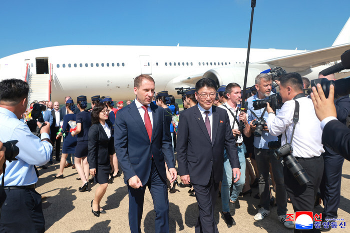 Russian Natural Resources and Ecology Minister Alexander Kozlov (L), accompanied by North Korea's External Economic Relations Minister Yun Jong-ho, arrives at the international airport in Pyongyang on July 28, 2025, via the first direct flight linking Moscow to the North Korean capital, operated by Nordwind Airlines, amid a strengthening of ties between the two nations, in this photo released by the North's official Korean Central News Agency the next day. Kozlov also serves as the chairman of the Russian side to the North Korea-Russia Inter-governmental Committee for Cooperation in Trade, Economy, Science and Technology. (For Use Only in the Republic of Korea. No Redistribution) (Yonhap)