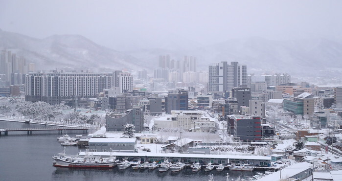 This photo, taken March 17, 2025, shows the port city of Sokcho in South Korea's northeastern province of Gangwon covered with snow following heavy snowfall overnight in the area. The snow was 30 centimeters deep in the city. (Yonhap)