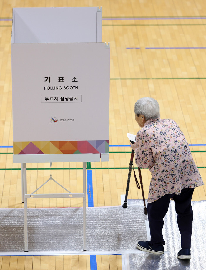 An elderly voter heads to a booth to fill out her ballot in the presidential election at a polling station in Chuncheon, the capital of South Korea's northeast province of Gangwon, on June 3, 2025. (Yonhap)