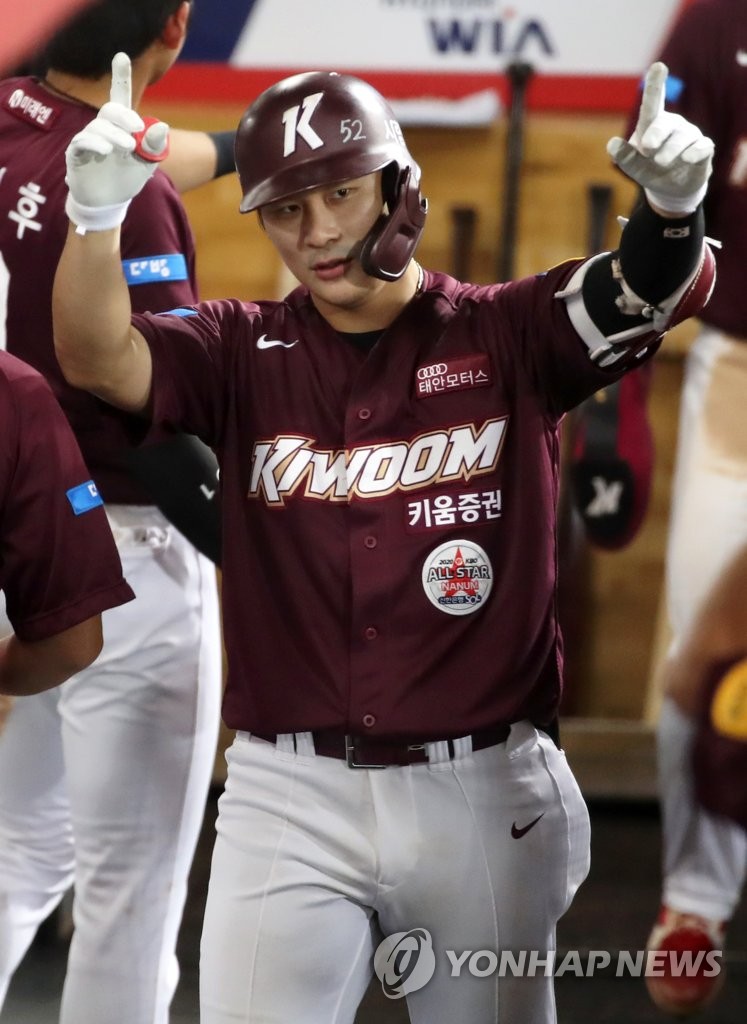▲ In this file photo from Sept. 23, 2020, Kim Ha-seong of the Kiwoom Heroes celebrates his two-run home run against the Kia Tigers during the top of the eighth inning of a Korea Baseball Organization regular season game at Gwangju-Kia Champions Field in Gwangju, 330 kilometers south of Seoul. (Yonhap)