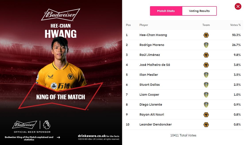 울버햄프턴은 이날 선제골을 지키지 못한 채 후반 추가 시간 리즈의 로드리고에게 페널티킥 동점골을 내줘 1-1로 비겼으나, 황희찬의 활약은 자신의 활약을 인정받았다.