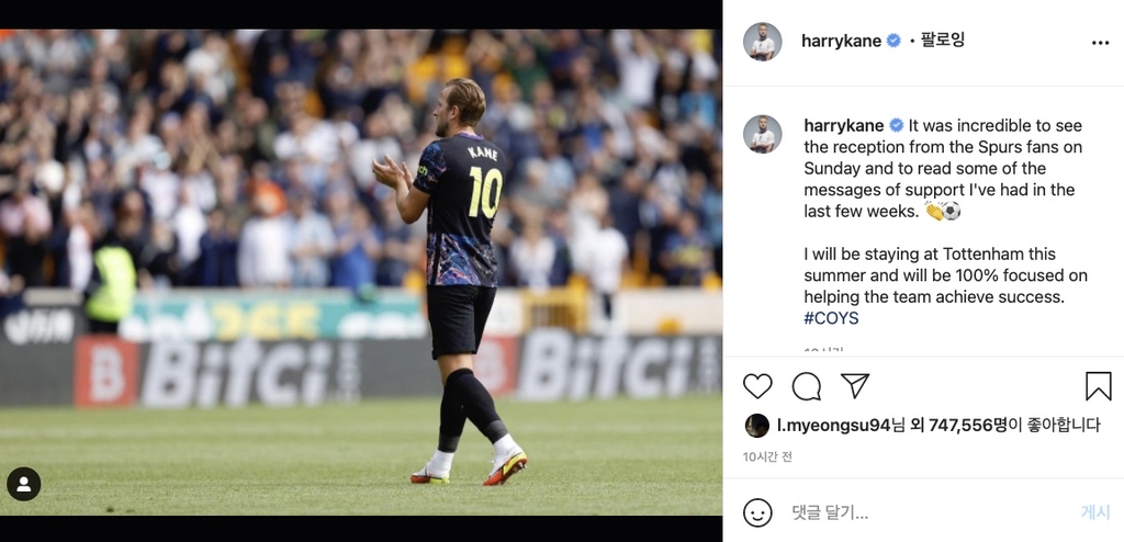 | ▲ 잔류 선언한 케인의 인스타 [해리 케인 인스타그램 캡처. 재판매 및 DB 금지] |