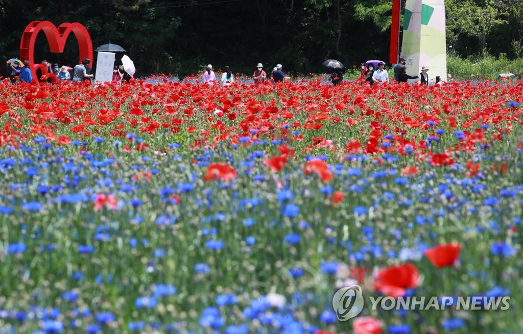 3만3천㎡에 달하는 꽃밭에는 꽃양귀비와 수레국화 등이 만개해 장관을 이룬다.