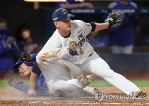 | ▲ In this file photo from Sept. 23, 2020, Drew Rucinski of the NC Dinos (R) collides with Kim Hun-gon of the Samsung Lions at home plate in the top of the fifth inning of a Korea Baseball Organization regular season game at Changwon NC Park in Changwon, 400 kilometers southeast of Seoul. (Yonhap) |
