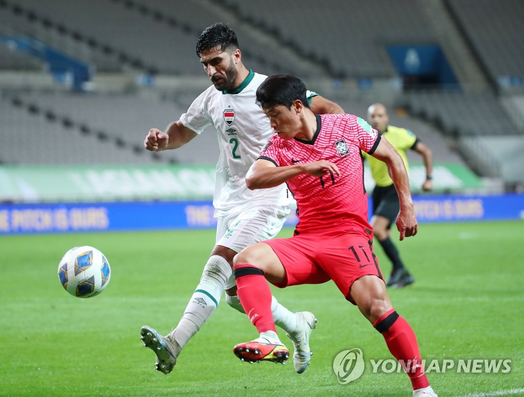 | ▲ In this file photo, Hwang Hee-chan of South Korea (R) battles Ahmed Ibrahim of Iraq for the ball during the teams' Group A match in the final Asian qualifying round for the 2022 FIFA World Cup at Seoul World Cup Stadium in Seoul on Sept. 2, 2021. (Yonhap) |