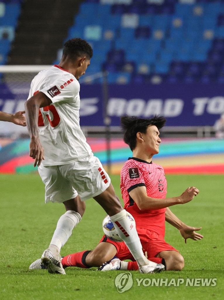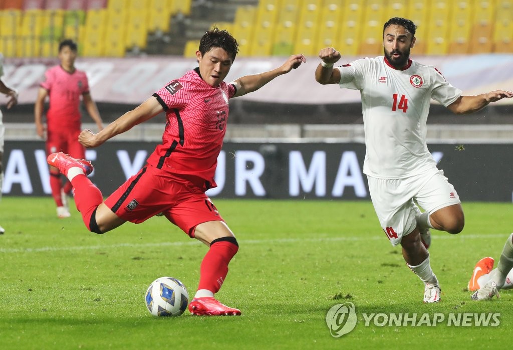 | ▲ In this file photo, Lee Dong-gyeong of South Korea (L) attempts a shot against Lebanon during the teams' Group A match in the final Asian qualifying round for the 2022 FIFA World Cup at Suwon World Cup Stadium in Suwon, Gyeonggi Province, on Sept. 7, 2021. (Yonhap) |