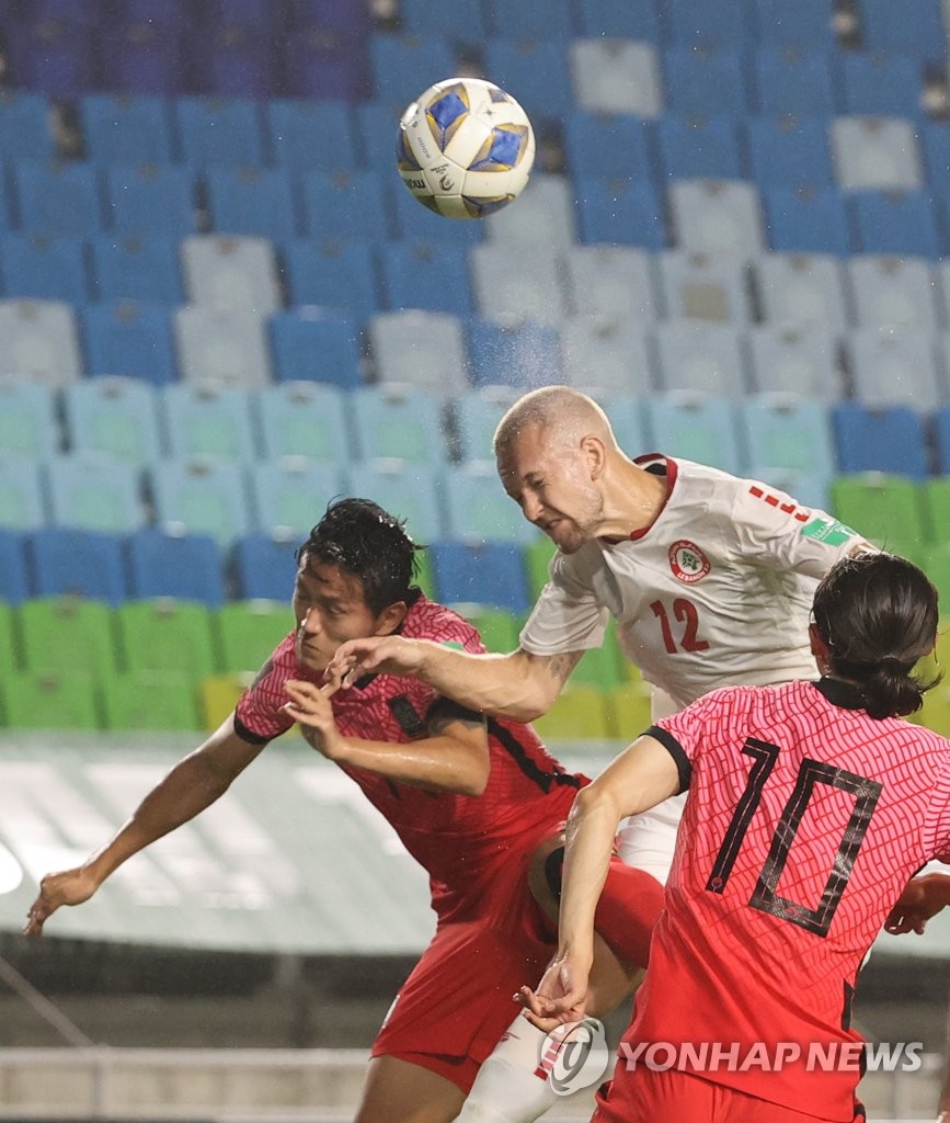| ▲ In this file photo, Hong Chul of South Korea (L) and Robert Melki of Lebanon (C) battle for the ball during the teams' Group A match in the final Asian qualifying round for the 2022 FIFA World Cup at Suwon World Cup Stadium in Suwon, Gyeonggi Province, on Sept. 7, 2021. (Yonhap) |