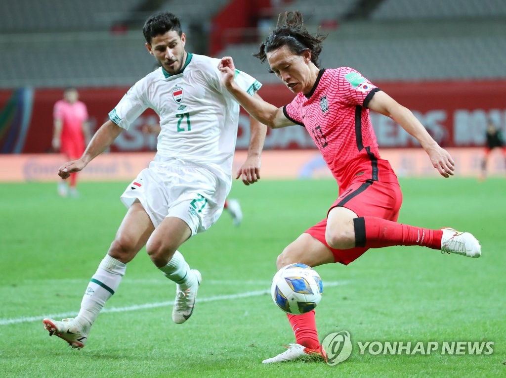 | ▲ In this file photo, Lee Jae-sung of South Korea (R) tries to make a pass past Sherko Kareem of Iraq during the teams' Group A match in the final Asian qualifying round for the 2022 FIFA World Cup at Seoul World Cup Stadium in Seoul on Sept. 2, 2021. (Yonhap) |