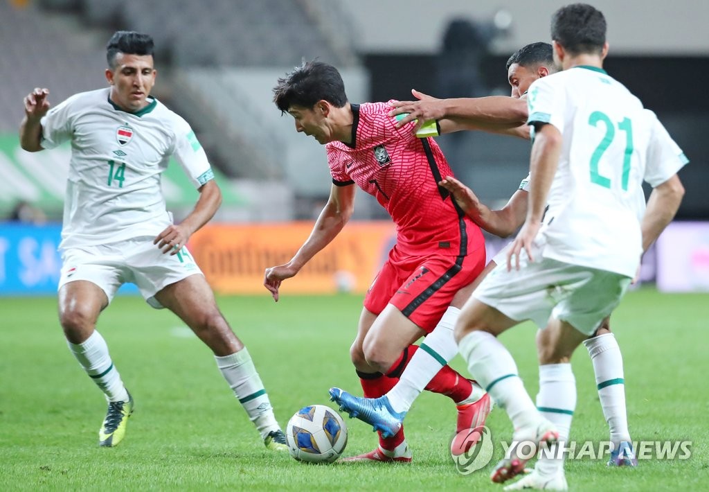 | ▲ In this file photo, Son Heung-min of South Korea (C) tries to dribble past Iraq defenders during the teams' Group A match in the final Asian qualifying round for the 2022 FIFA World Cup at Seoul World Cup Stadium in Seoul on Sept. 2, 2021. (Yonhap) |
