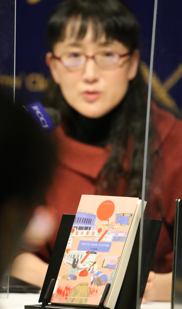 | ▲ (도쿄=연합뉴스) 이세원 특파원 = 25일 오후 도쿄 소재 일본외국특파원협회(FCCJ)에서 유미리 작가가 기자회견을 하고 있는 가운데 탁자에 그에게 미국도서상을 안겨준 소설 'JR 우에노역 공원 출구'를 번역한 'Tokyo Ueno Station'이 놓여 있다. |
