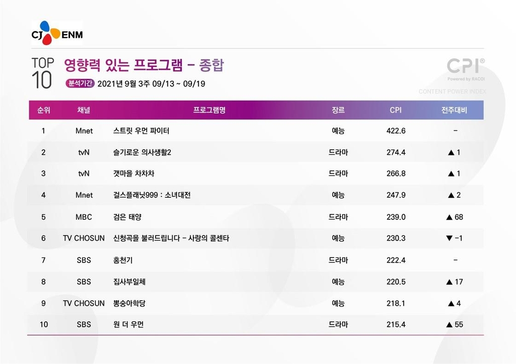 한편, CPI 1위는 지난주에 이어 엠넷 댄스 경연 프로그램 '스트릿 우먼 파이터'가 차지했다. CPI 지수는 422.6으로 2위인 tvN 드라마 '슬기로운 의사생활2'(274.4)와도 큰 격차를 벌렸다.