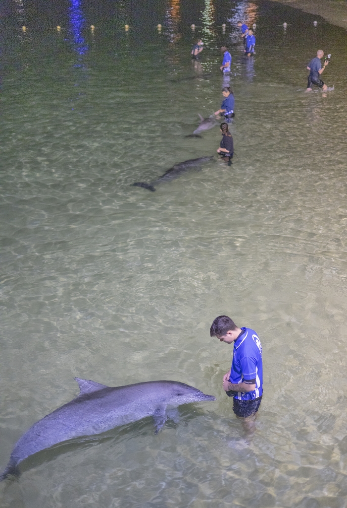 해가 뉘엿뉘엿 넘어가자 1번부터 5번까지 다양한 돌고래가 각자 익숙한 에코 레인저팀 스태프 앞으로 다가와 차례를 기다린다.