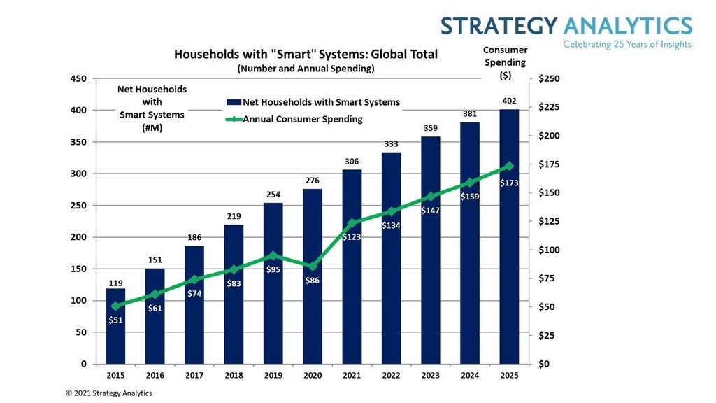 SA는 또 스마트홈 시장이 계속 성장해 2025년에는 소비자 지출이 1천730억 달러로 늘고, 스마트홈 기기 설치 가구 수도 4억200만 가구로 전체의 20%에 육박할 것으로 예상했다.