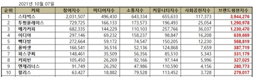 ▲ 한국기업평판연구소가 발표한 '2021년 10월 커피전문점 브랜드 평판' 순위 [한국기업평판연구소 블로그 갈무리]
