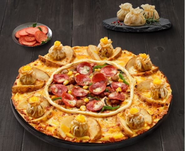 간편 한식 브랜드 비비고와 협업해 내놓은 제품으로, 피자 크러스트 부분에 복주머니 모양의 돼지고기 만두가 얹혔다.