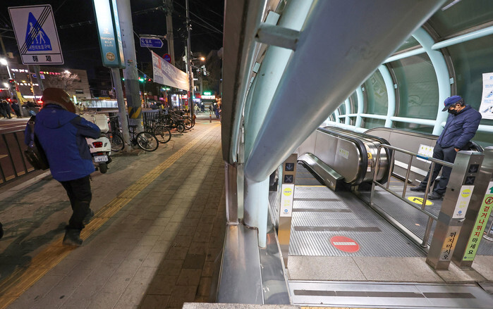 A daily wage worker beats the cold at the entrance of a subway station in Seoul's Guro Ward on Feb. 18, 2025, waiting to be employed for the day. The number of employees in the construction sector decreased 168,000 from a year earlier to 1.92 million in January, its lowest level since 1.88 million in 2017. (Yonhap)
