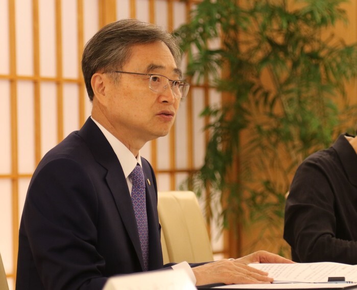 South Korean Foreign Minister Cho Hyun speaks to Japanese Foreign Minister Takeshi Iwaya (not pictured) during their meeting at the foreign ministry in Tokyo on July 29, 2025. (Yonhap)