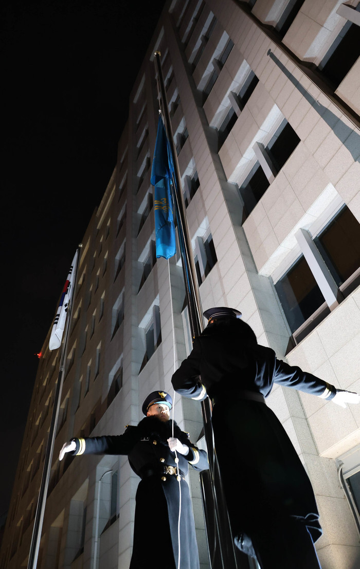 A flag bearing the South Korean president's symbol -- a double phoenix with a rose of Sharon -- is lowered at the presidential office in Seoul on Dec. 29, 2025, as President Lee Jae Myung begins working at the former presidential office Cheong Wa Dae in the capital, starting the same day, with the office officially relocated to it after three years and seven months. (Yonhap)