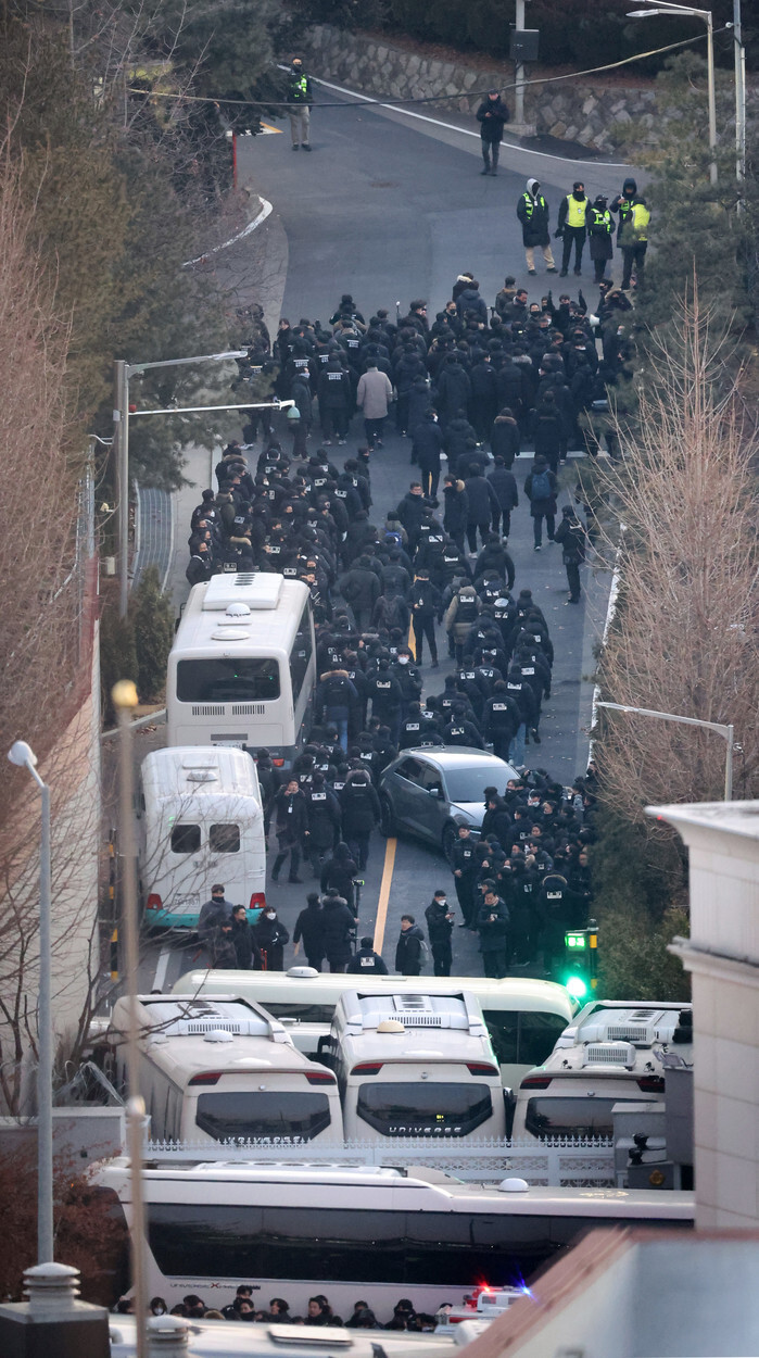 Investigators from the police make their way to the premises of impeached President Yoon Suk Yeol's official residence in Seoul on Jan. 15, 2025, after police and the anti-corruption agency began their second attempt to execute a warrant to detain Yoon in connection to his short-lived imposition of martial law. (Yonhap)