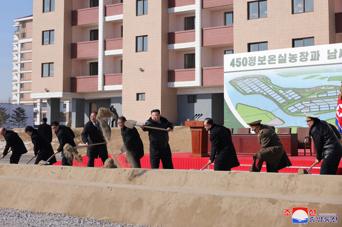 North Korean leader Kim Jong-un (6th from L) attends a groundbreaking ceremony in Sinuiju, North Pyongan Province, on Feb. 10, 2025, for a 450-hectare greenhouse farm and vegetable science research base, in this photo released by the North's official Korean Central News Agency the next day. (For Use Only in the Republic of Korea. No Redistribution) (Yonhap)