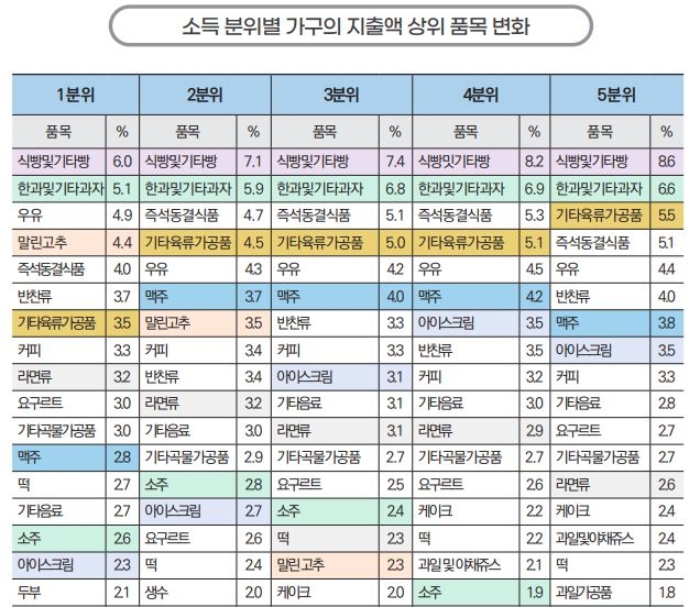 소득이 높아질수록 지출 비중 순위가 낮아지는 품목은 말린 고추, 라면류, 김, 소주 등이었다. 반면 기타 육류가공품, 아이스크림, 맥주는 소득분위가 높을수록 지출 비중 순위도 높았다.