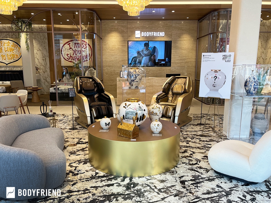 지난 2월 개장한 부산 해운대 전시장에는 현대미술가 강준영의 도자와 캔버스 작품 30여점을 곳곳에 놓았다. 고객이 안마의자를 체험하며 작품도 감상할 수 있도록 구도에 신경을 썼다.