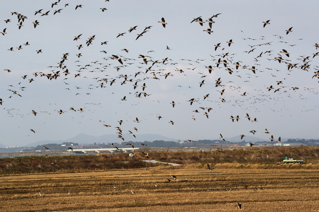 가을이 깊어지던 11월 천수만 철새도래지에는 대표적 겨울 철새인 기러기 수천 마리가 벌써 찾아와 있었다. 벼를 베어낸 논바닥에 무리 지어 앉아 있던 기러기들은 떼를 지어 한꺼번에 날아올랐다 내려앉는 군무를 펼쳐 보였다.