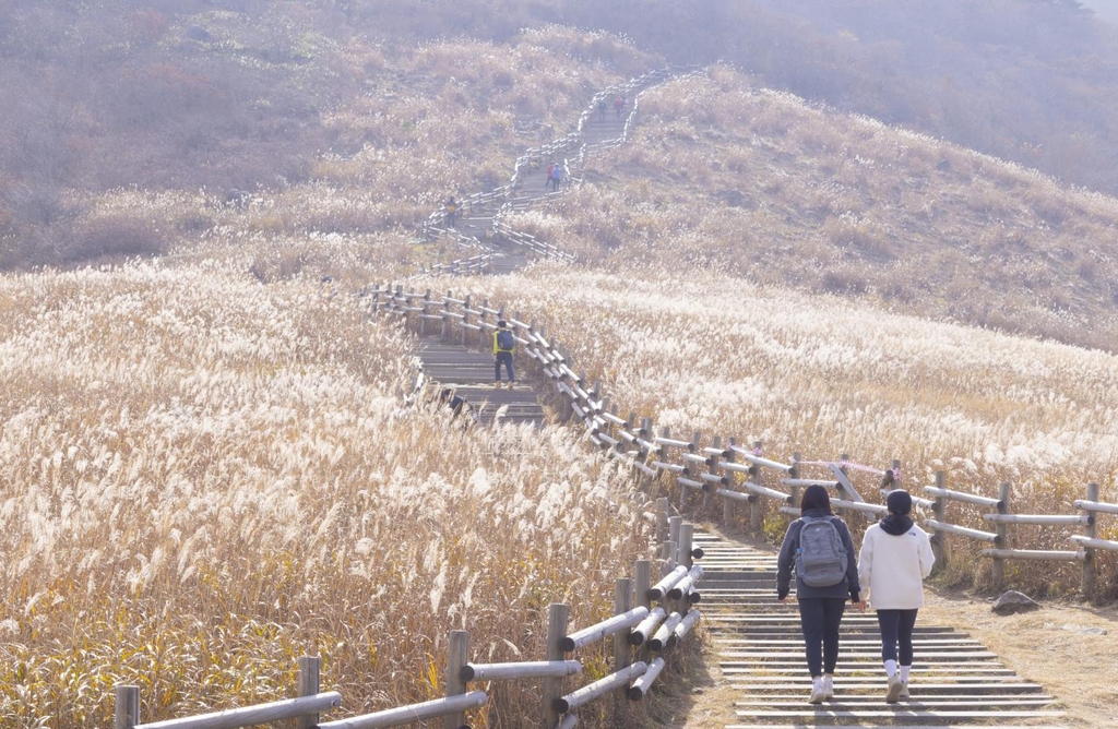 황금빛 억새가 바람에 따라 춤을 추고, 거대한 억새 속으로 난 길로 사람들이 콩알만큼 작은 점처럼 움직였다.