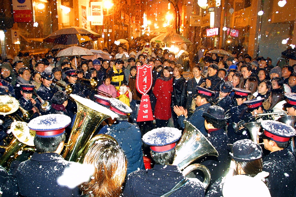 | ▲ 성탄절 전야 서울 명동거리에서 함박눈이 내리는 가운데 구세군 자선냄비를 찾은 사람들. 2000년 [연합뉴스 자료사진] |